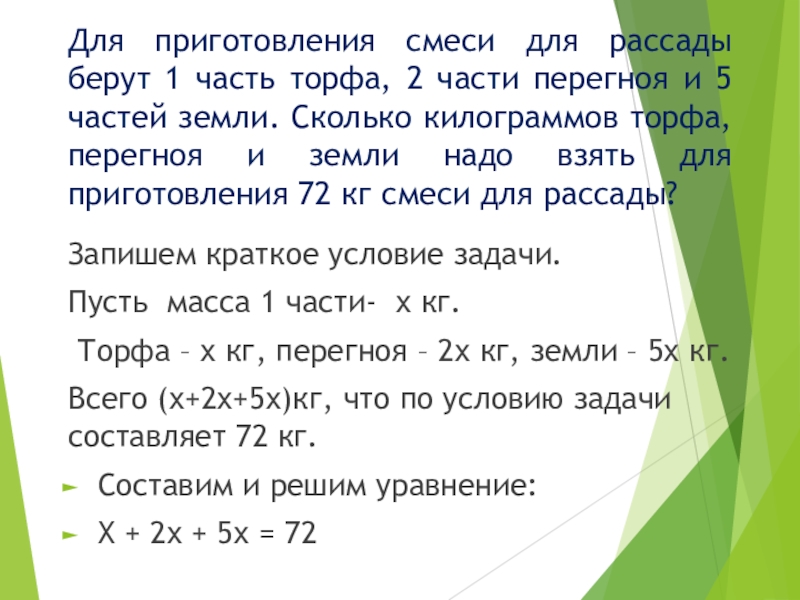 Торфа – х кг, перегноя – 2х кг, земли – 5х кг.