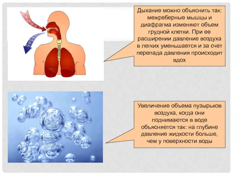 Увеличение объема пузырьков воздуха, когда они поднимаются в воде объясняется так: на глубине давление жидкости больше, чем у поверхности воды
