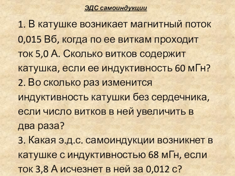 ЭДС самоиндукции1. В катушке возникает магнитный поток 0,015 Вб, когда по ее виткам проходит ток 5,0 А. Сколько витков содержит катушка, если ее индуктивность 60 мГн? 2. Во сколько раз изменится индуктивность катушки