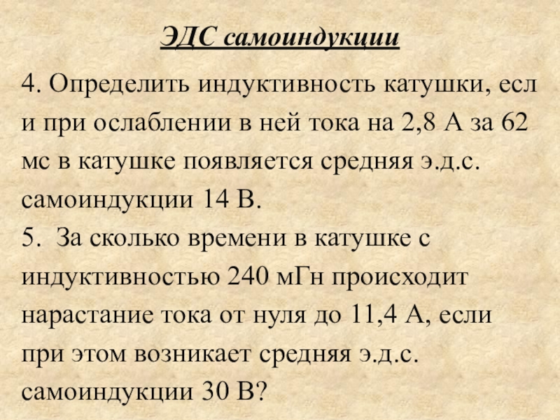 ЭДС самоиндукции4. Определить индуктивность катушки, если при ослаблении в ней тока на 2,8 А за 62 мс в катушке появляется средняя э.д.с.