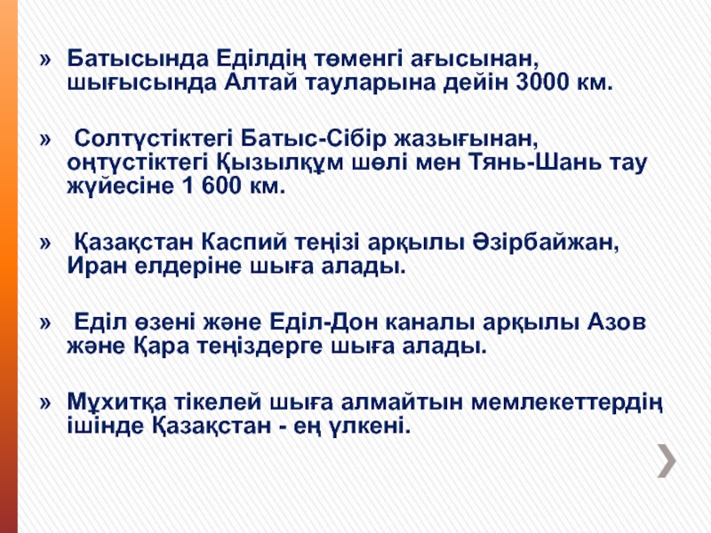 Слайд 4Бaтысында Еділдің төмeнгі ағысынан, шығысында Алтай тауларына дейін 3000 км.