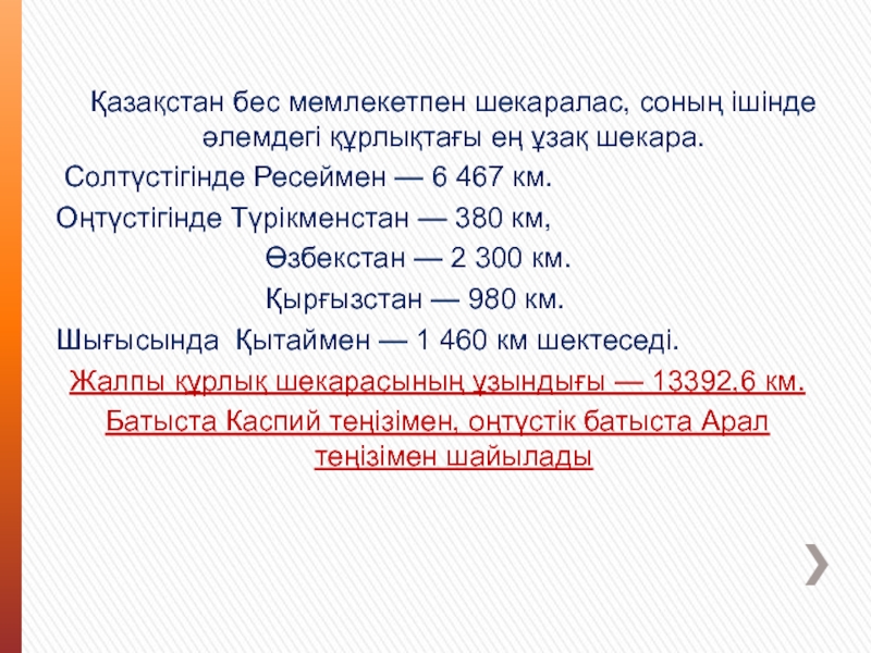 Слайд 3 Қазақстан бес мемлекетпен шекаралас, соның ішінде әлемдегі құрлықтағы