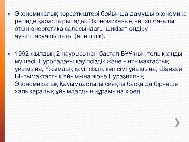Слайд 7Экономикалық көрсeткіштері бойынша дамушы экономика ретінде қарастырылады. Экономиканың негізгі бағыты
