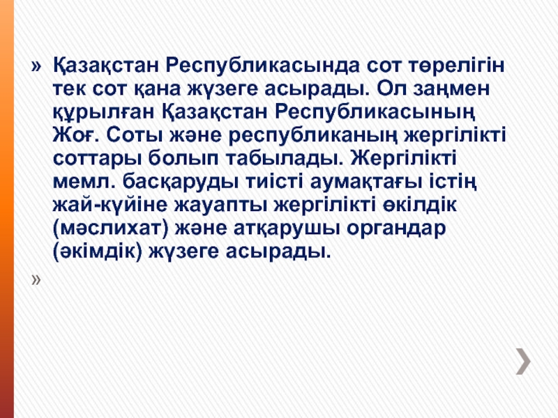 Слайд 11Қазақстан Республикасында сот төрелігін тек сот қана жүзеге асырады. Ол