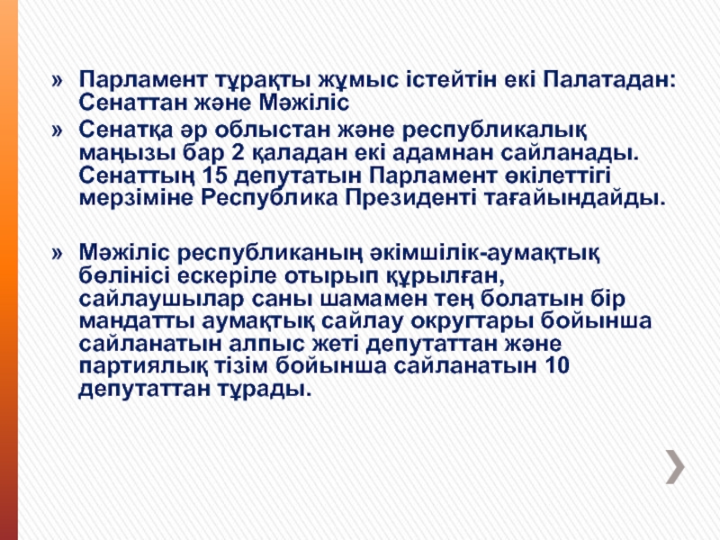 Слайд 9Парламент тұрақты жұмыс істейтін екі Палатадан: Сенаттан және Мәжіліс