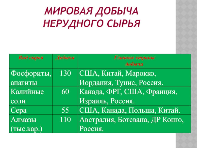 - природные ресурсы для промышленности: топливно-энергетические; металлургические; химическое и прочее сырье;