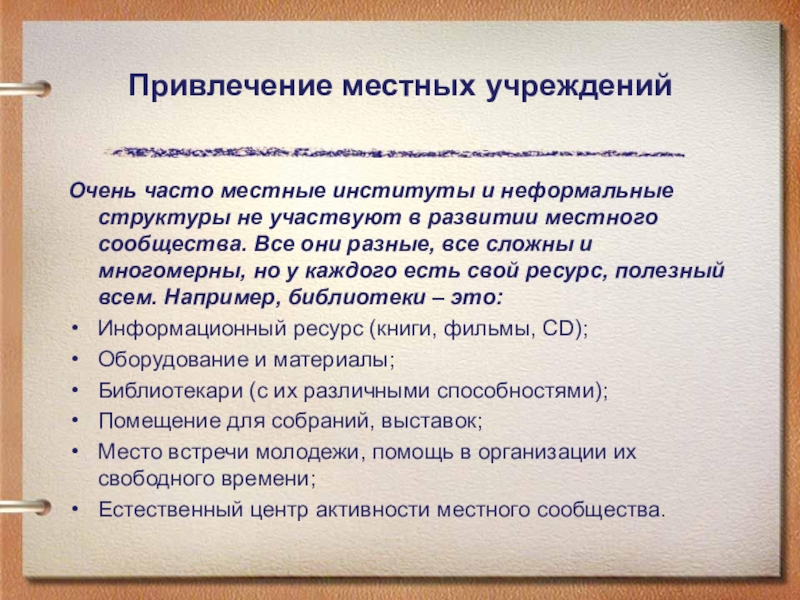 Каждая ассоциация, организация или учреждение имеет еще не использованный ресурс для развития сообщества;