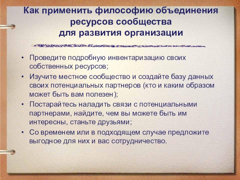 Слайд 23Как применить философию объединения ресурсов сообщества