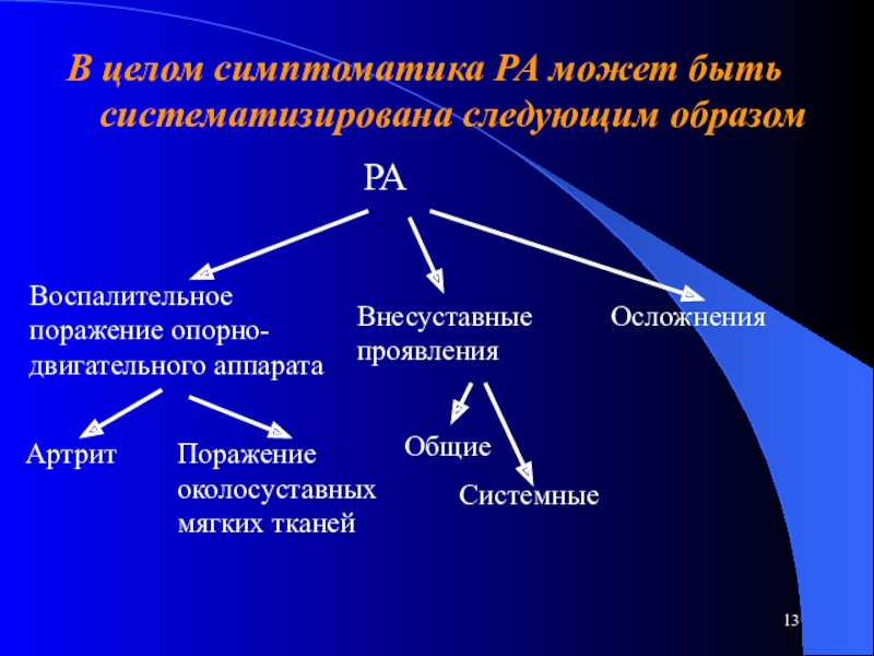 Слайд 13В целом симптоматика РА может быть систематизирована следующим образом