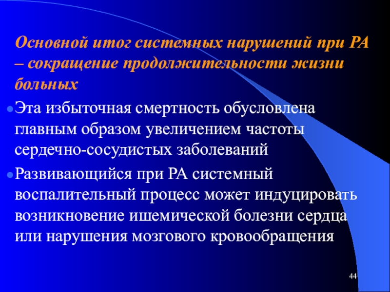 Слайд 44Основной итог системных нарушений при РА – сокращение продолжительности жизни