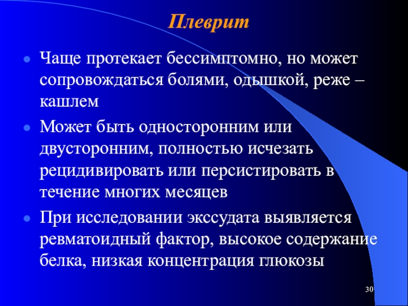 В экссудате обычно повышено содержание белка и лактатдегидрогеназы, снижен уровень глюкозы