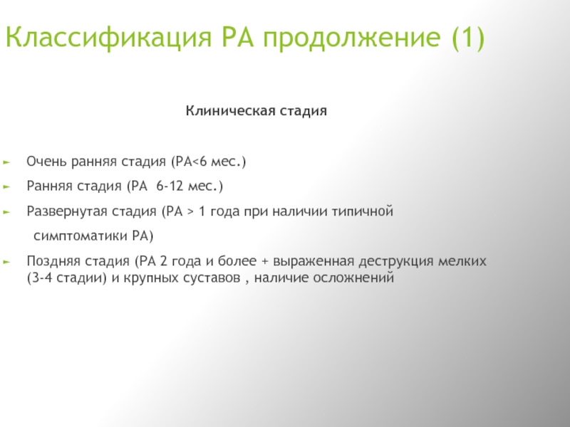 Поздняя стадия (РА 2 года и более + выраженная деструкция мелких (3-4 стадии) и крупных суставов , наличие осложнений