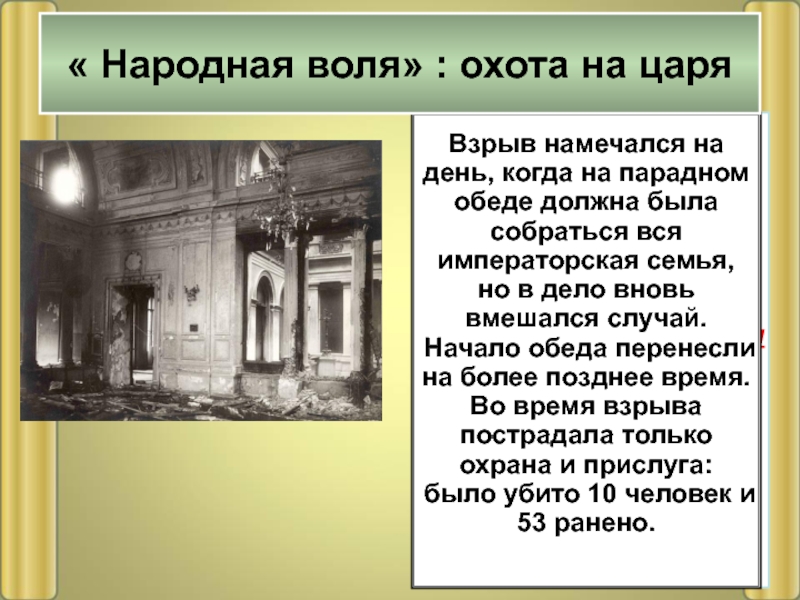 Взрыв намечался на день, когда на парадном обеде должна была собраться вся императорская семья, но в дело вновь вмешался случай. Начало обеда перенесли на более позднее время. Во время взрыва пострадала только охрана и прислуга: было убито 10 человек и 53 ранено.