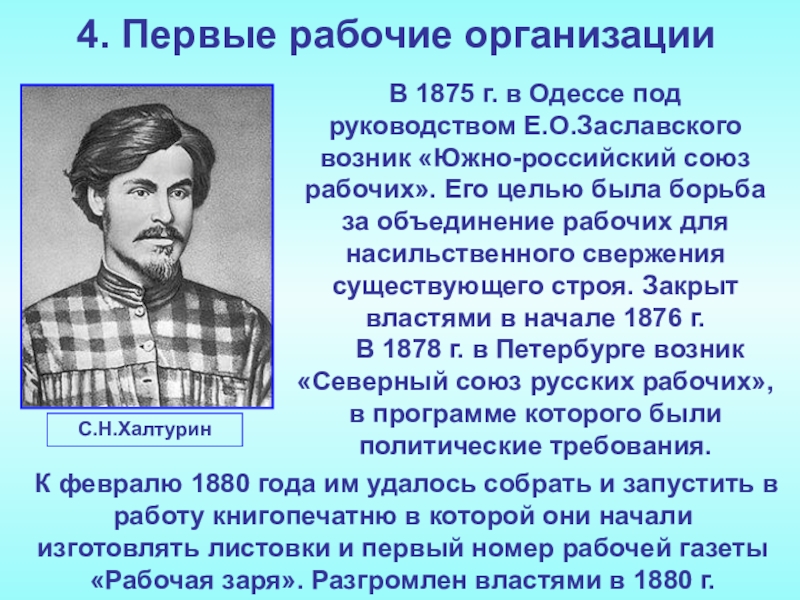 К февралю 1880 года им удалось собрать и запустить в работу книгопечатню в которой они начали изготовлять листовки и первый номер рабочей газеты «Рабочая заря». Разгромлен властями в 1880 г.