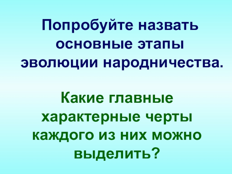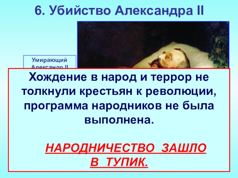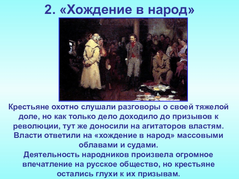 Хождение в народ и террор не толкнули крестьян к революции, программа народников не была выполнена.