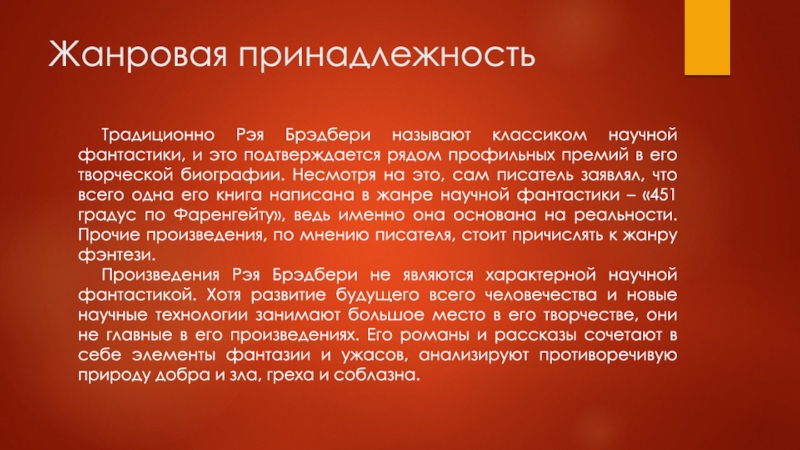это, сам писатель заявлял, что всего одна его книга написана в жанре научной фантастики – «451 градус по Фаренгейту», ведь именно она основана на реальности. Прочие произведения, по мнению писателя, стоит причислять к жанру фэнтези.