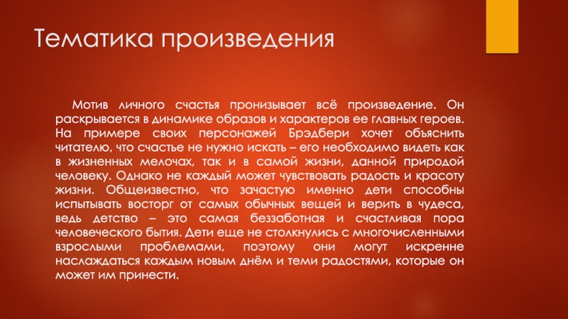 персонажей Брэдбери хочет объяснить читателю, что счастье не нужно искать – его необходимо видеть как в жизненных мелочах, так и в самой жизни, данной природой человеку. Однако не каждый может чувствовать радость и красоту жизни. Общеизвестно, что зачастую именно дети способны испытывать восторг от самых обычных вещей и верить в чудеса, ведь детство – это самая беззаботная и счастливая пора человеческого бытия. Дети еще не столкнулись с многочисленными взрослыми проблемами, поэтому они могут искренне наслаждаться каждым новым днём и теми радостями, которые он может им принести.