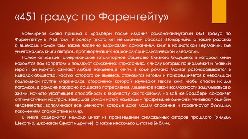 романа-антиутопии «451 градус по Фаренгейту» в 1953 году. В основу