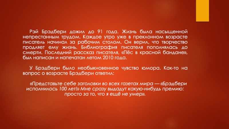 Слайд 14Рэй Брэдбери дожил до 91 года. Жизнь была насыщенной непрестанным