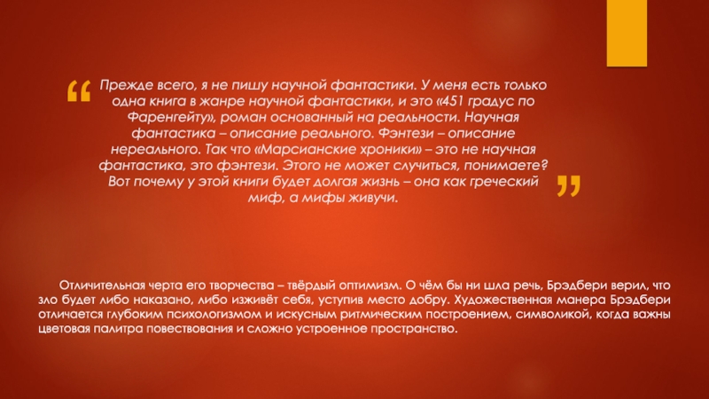 градус по Фаренгейту», роман основанный на реальности. Научная фантастика – описание реального. Фэнтези – описание нереального. Так что «Марсианские хроники» – это не научная фантастика, это фэнтези. Этого не может случиться, понимаете? Вот почему у этой книги будет долгая жизнь – она как греческий миф, а мифы живучи.