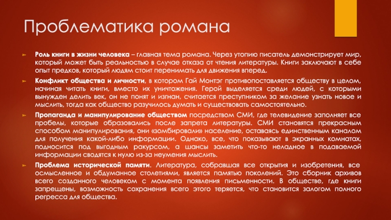 Проблема исторической памяти. Литература, собравшая все открытия и изобретения, все осмысленное и обдуманное столетиями, является памятью поколений. Это сборник архивов всего созданного человеком с момента появления письменности. В обществе, где книги запрещены, возможность сохранения всего этого теряется, что становится залогом полного регресса для общества.