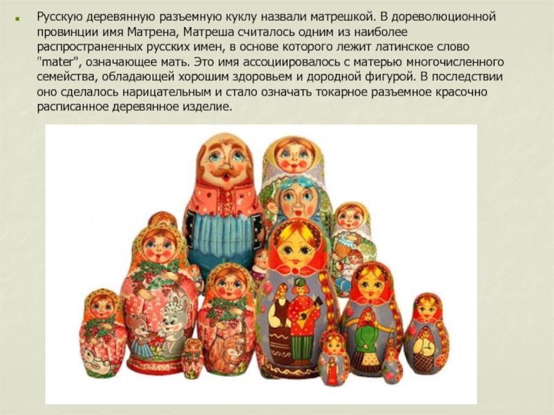 основе которого лежит латинское слово "mater", означающее мать. Это имя ассоциировалось с матерью многочисленного семейства, обладающей хорошим здоровьем и дородной фигурой. В последствии оно сделалось нарицательным и стало означать токарное разъемное красочно расписанное деревянное изделие.