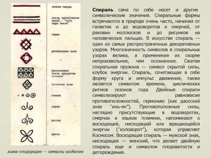 до водоворотов и смерчей, от раковин моллюсков и до рисунков на человеческих пальцах. В искусстве спираль — один из самых распространенных декоративных узоров. Многозначность символов в спиральных узорах велика, а применение их скорее непроизвольное, чем осознанное. Сжатая спиральная пружина — символ скрытой силы, клубок энергии. Спираль, сочетающая в себе форму круга и импульс движения, также является символом времени, циклических ритмов сезонов года. Двойные спирали символизируют равновесие противоположностей, гармонию (как даосский знак "инь-ян”). Противоположные силы, наглядно присутствующие в водоворотах, смерчах и языках пламени, напоминают о восходящей, нисходящей или вращающейся энергии ("коловорот”), которая управляет Космосом. Восходящая спираль — мужской знак, нисходящая — женский, что делает двойную спираль еще и символом плодовитости и деторождения.