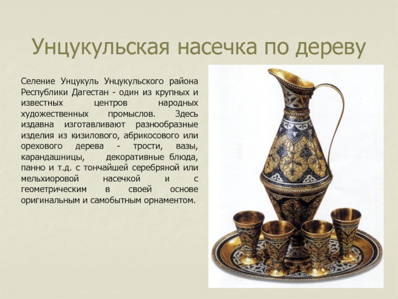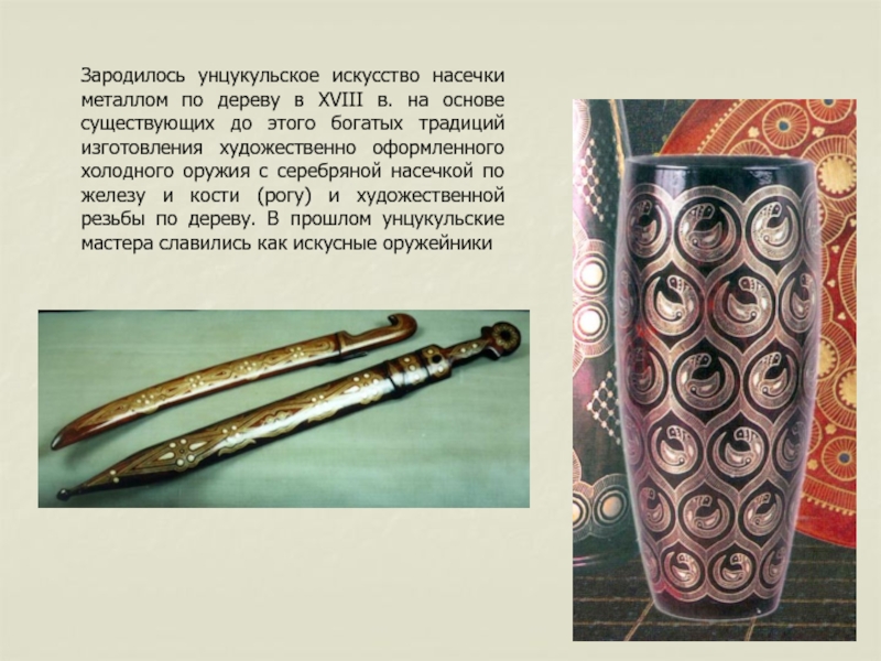 Слайд 24Зародилось унцукульское искусство насечки металлом по дереву в XVIII в.