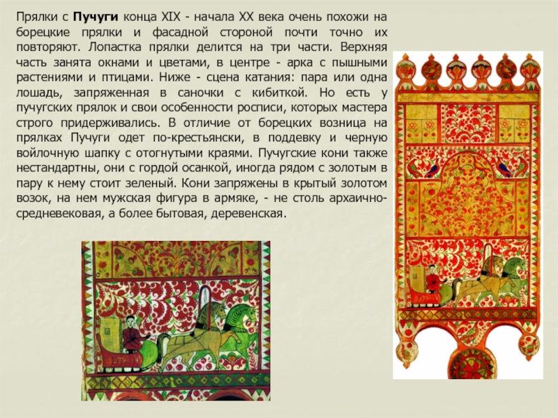 повторяют. Лопастка прялки делится на три части. Верхняя часть занята окнами и цветами, в центре - арка с пышными растениями и птицами. Ниже - сцена катания: пара или одна лошадь, запряженная в саночки с кибиткой. Но есть у пучугских прялок и свои особенности росписи, которых мастера строго придерживались. В отличие от борецких возница на прялках Пучуги одет по-крестьянски, в поддевку и черную войлочную шапку с отогнутыми краями. Пучугские кони также нестандартны, они с гордой осанкой, иногда рядом с золотым в пару к нему стоит зеленый. Кони запряжены в крытый золотом возок, на нем мужская фигура в армяке, - не столь архаично-средневековая, а более бытовая, деревенская.