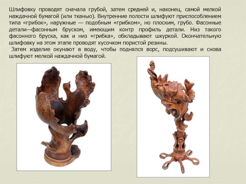 Затем изделие окунают в воду, чтобы поднялся ворс, подсушивают и снова шлифуют мелкой наждачной бумагой.