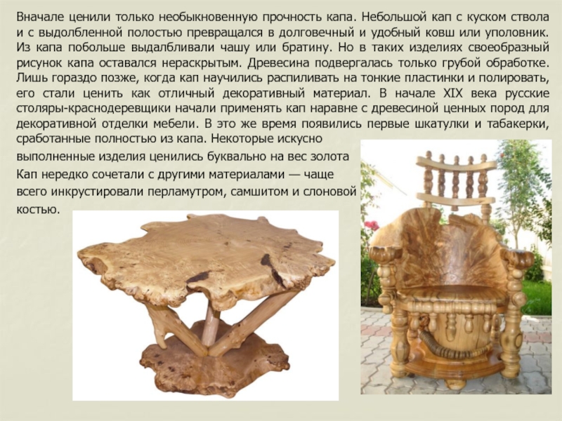 ковш или уполовник. Из капа побольше выдалбливали чашу или братину. Но в таких изделиях своеобразный рисунок капа оставался нераскрытым. Древесина подвергалась только грубой обработке. Лишь гораздо позже, когда кап научились распиливать на тонкие пластинки и полировать, его стали ценить как отличный декоративный материал. В начале ХIХ века русские столяры-краснодеревщики начали применять кап наравне с древесиной ценных пород для декоративной отделки мебели. В это же время появились первые шкатулки и табакерки, сработанные полностью из капа. Некоторые искусно