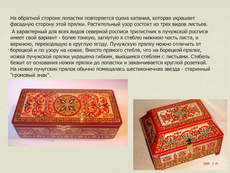 А характерный для всех видов северной росписи трилистник в пучужской росписи имеет свой вариант - более тонкую, загнутую к стеблю нижнюю часть листа, и верхнюю, переходящую в круглую ягоду. Пучужскую прялку можно отличить от борецкой и по узору на ножке. Вместо прямого стебля, что на борецкой прялке, ножка пучужской прялки украшена гибким, вьющимся стеблем с листьями. Стебель бежит от основания ножки прялки до лопастки и заканчивается круглой розеткой. На ножке пучугских прялок обычно помещалась шестиконечная звезда - старинный "громовый знак".