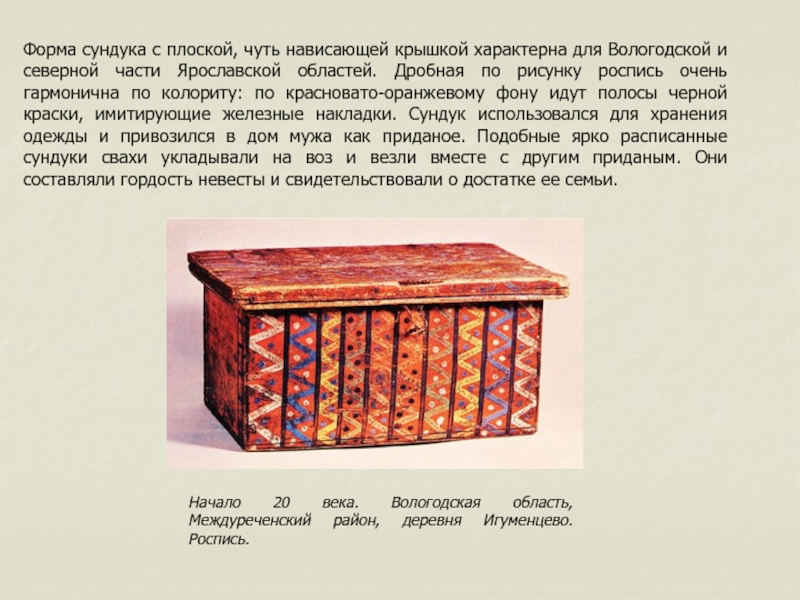 гармонична по колориту: по красновато-оранжевому фону идут полосы черной краски, имитирующие железные накладки. Сундук использовался для хранения одежды и привозился в дом мужа как приданое. Подобные ярко расписанные сундуки свахи укладывали на воз и везли вместе с другим приданым. Они составляли гордость невесты и свидетельствовали о достатке ее семьи.