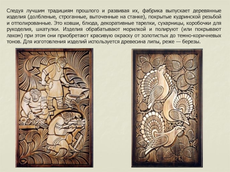 Слайд 11Следуя лучшим традициям прошлого и развивая их, фабрика выпускает деревянные