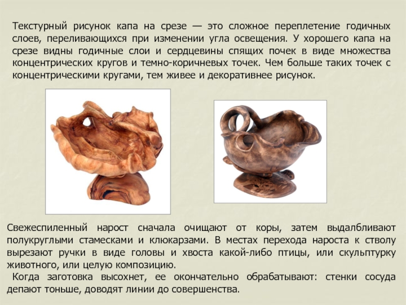 Слайд 17Текстурный рисунок капа на срезе — это сложное переплетение годичных