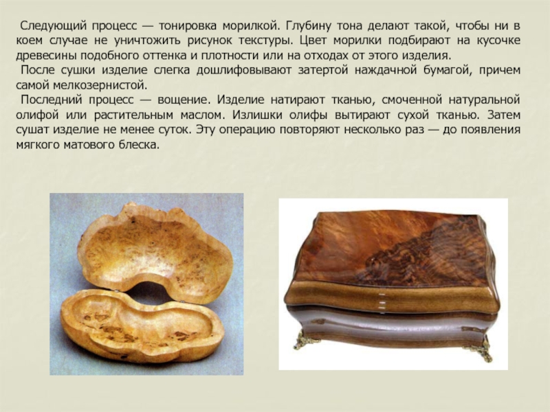 Слайд 19 Следующий процесс — тонировка морилкой. Глубину тона делают такой,