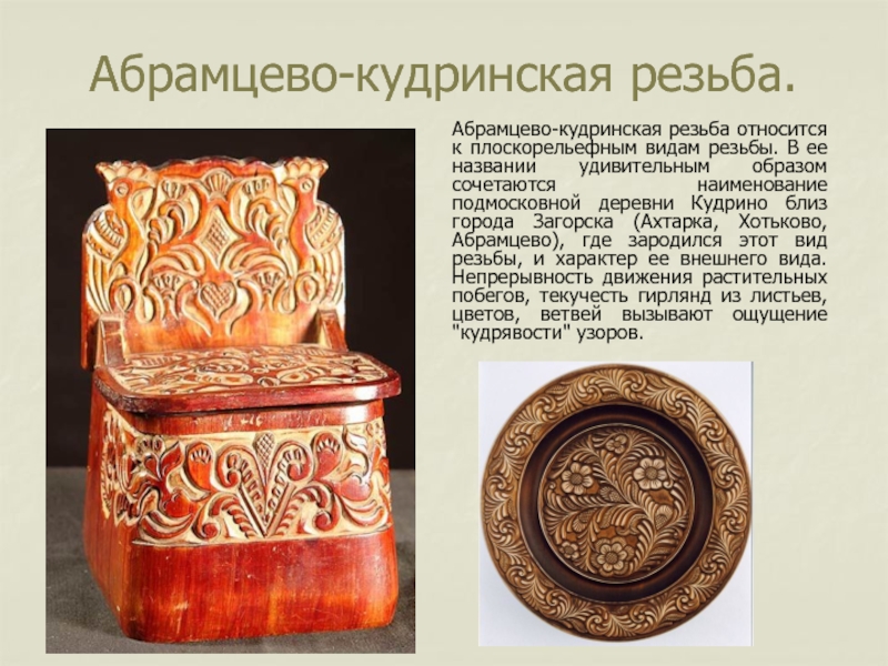 Абрамцево-кудринская резьба относится к плоскорельефным видам резьбы. В ее