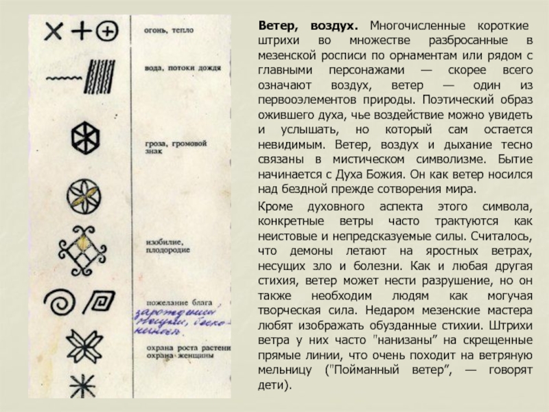 Кроме духовного аспекта этого символа, конкретные ветры часто трактуются как неистовые и непредсказуемые силы. Считалось, что демоны летают на яростных ветрах, несущих зло и болезни. Как и любая другая стихия, ветер может нести разрушение, но он также необходим людям как могучая творческая сила. Недаром мезенские мастера любят изображать обузданные стихии. Штрихи ветра у них часто "нанизаны” на скрещенные прямые линии, что очень походит на ветряную мельницу ("Пойманный ветер”, — говорят дети).