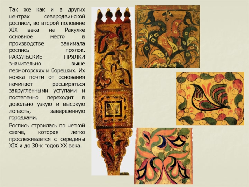 занимала роспись прялок. РАКУЛЬСКИЕ ПРЯЛКИ значительно выше пермогорских и борецких. Их ножка почти от основания начинает расширяться закругленными уступами и постепенно переходит в довольно узкую и высокую лопасть, завершенную городками.