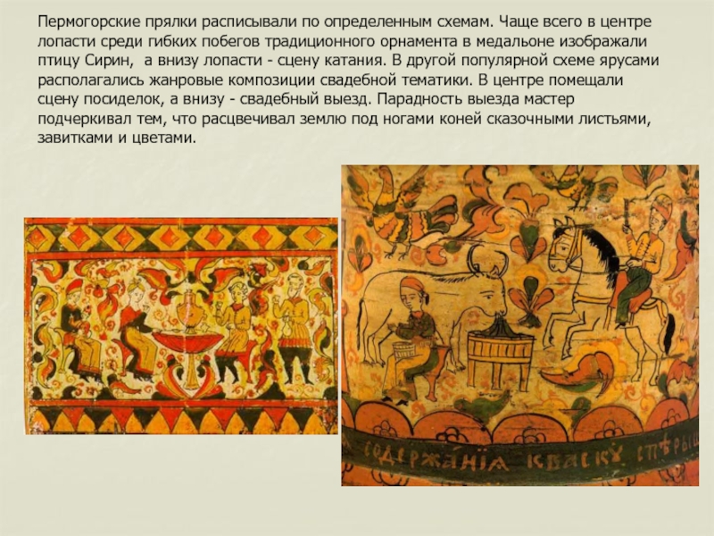 Слайд 42Пермогорские прялки расписывали по определенным схемам. Чаще всего в центре