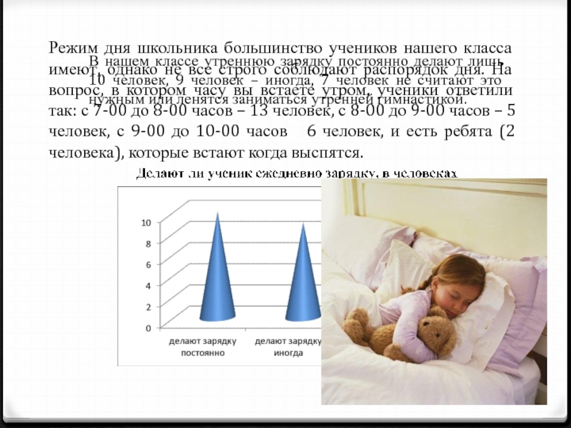 вы встаете утром, ученики ответили так: с 7-00 до 8-00 часов – 13 человек, с 8-00 до 9-00 часов – 5 человек, с 9-00 до 10-00 часов 6 человек, и есть ребята (2 человека), которые встают когда выспятся.