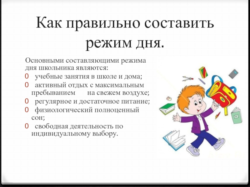 и как выполнять домашние задания, не затрачивая на это весь вечер, все утро? Что нужно сделать, чтобы хорошо учиться в школе? Все эти проблемы помогает решить правильно организованный режим дня.