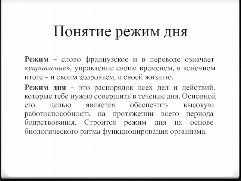 Режим дня – это распорядок всех дел и действий, которые тебе нужно совершить в течение дня. Основной его целью является обеспечить высокую работоспособность на протяжении всего периода бодрствования. Строится режим дня на основе биологического ритма функционирования организма.