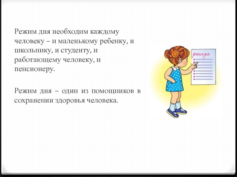 Слайд 2Режим дня необходим каждому человеку – и маленькому ребенку, и