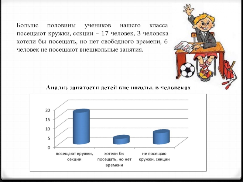Слайд 12Больше половины учеников нашего класса посещают кружки, секции – 17