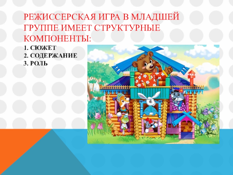 Слайд 12Режиссерская игра в младшей группе имеет структурные компоненты: 1. Сюжет 2. Содержание 3.