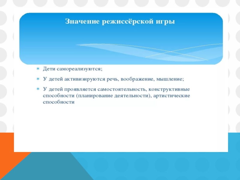 Слайд 7Режиссерская игра 3- 4 лет способствует: - самореализации детей - активизации речи,