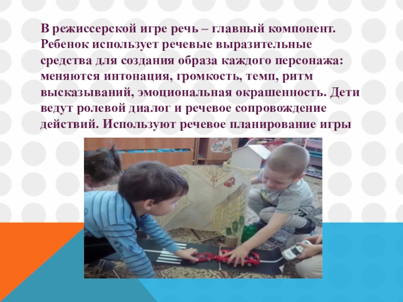 Слайд 6В режиссерской игре речь – главный компонент. Ребенок использует речевые