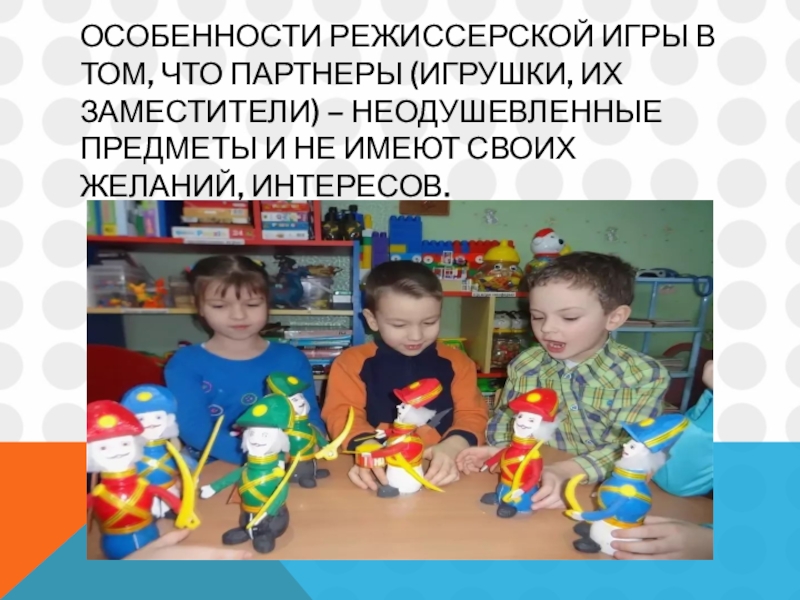Особенности режиссерской игры в том, что партнеры (игрушки, их заместители) – неодушевленные предметы и не имеют своих