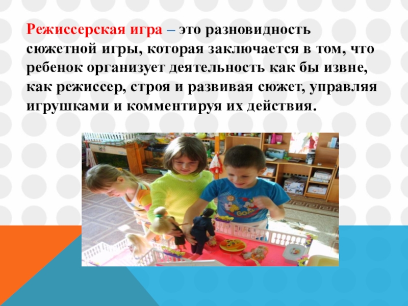 Слайд 2Режиссерская игра – это разновидность сюжетной игры, которая заключается в